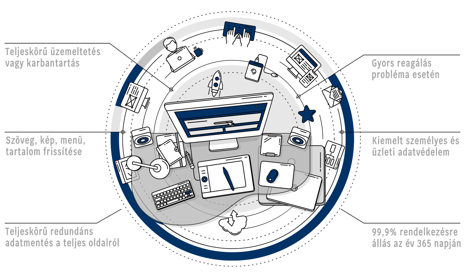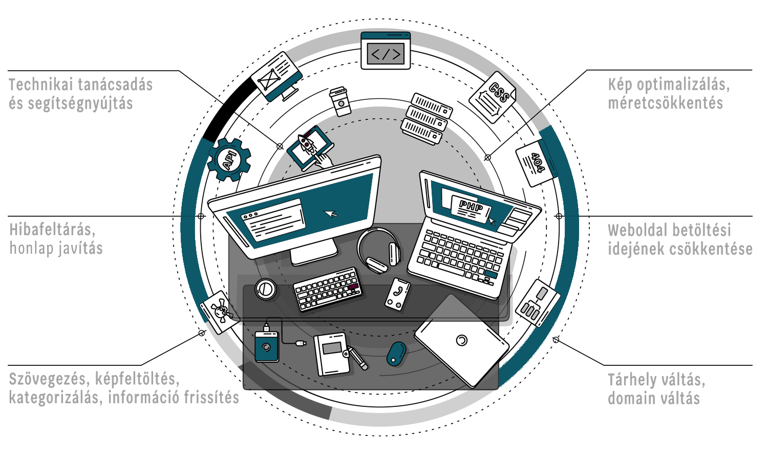 Választható teljes körű üzemeltetés vagy karbantartás. Minden esetben a weboldalak folyamatosan monitorozva és frissítve vannak, hogy megelőzzük az esetleges hibákat és sebezhetőségeket.